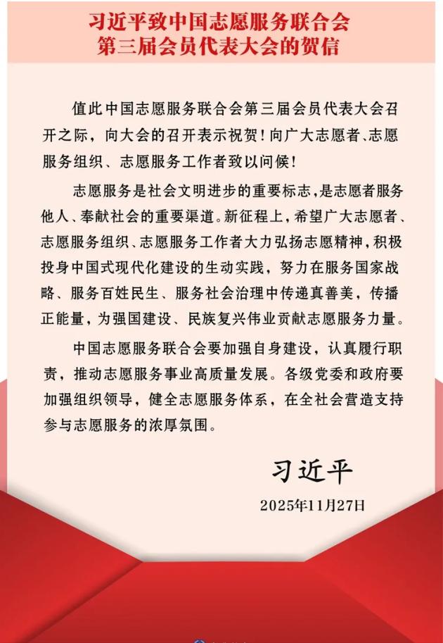 中国志愿服务联合会第三届会员代表大会27日至28日在京召开,会上宣读了习近平的贺信。