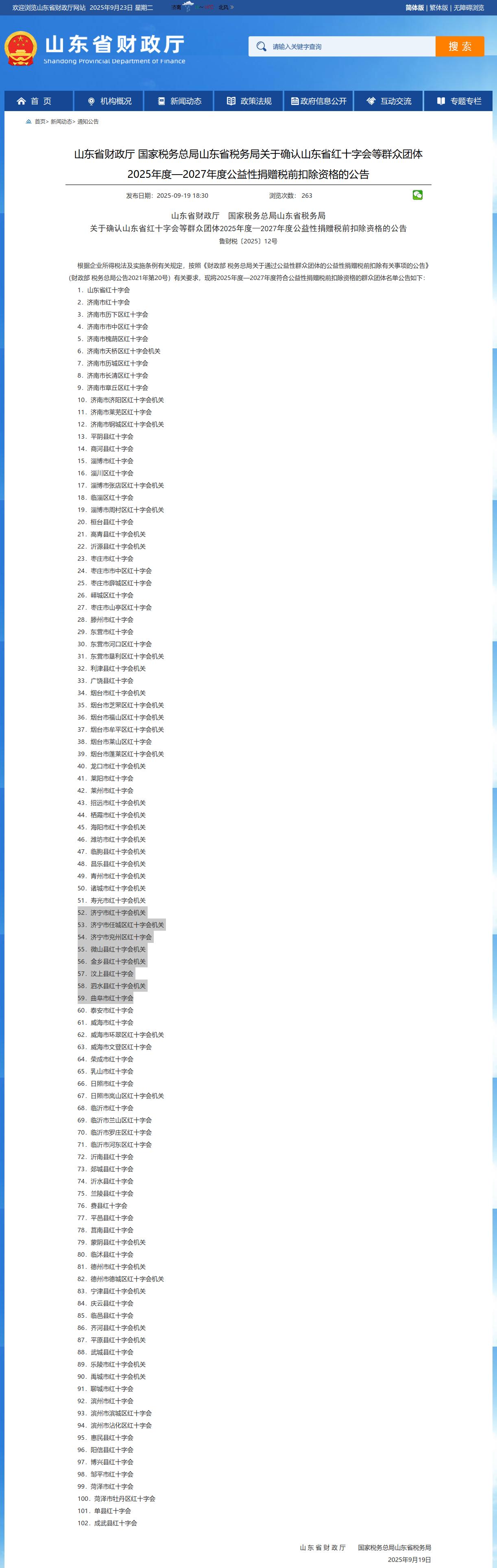 2025年9月19日,山东省财政厅、国家税务总局山东省税务局,发布《关于确认山东省红十字会等群众团体2025年度—2027年度公益性捐赠税前扣除资格的公告》(鲁财税〔2025〕12号),确认了济宁市域内济宁市红十字会机关、济宁市任城区红十字会机关、济宁市兖州区红十字会、微山县红十字会机关、金乡县红十字会机关、汶上县红十字会、泗水县红十字会机关、曲阜市红十字会共8家单位的公益性捐赠税前扣除资格。